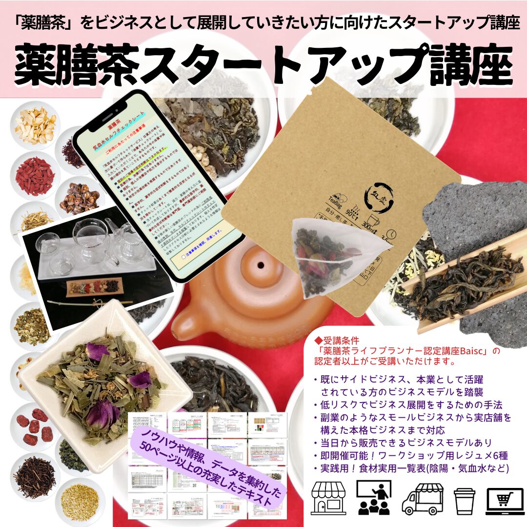 『薬膳茶スタートアップ講座』は、副業や無店舗経営のようなスモールビジネスから実店舗を構えて...